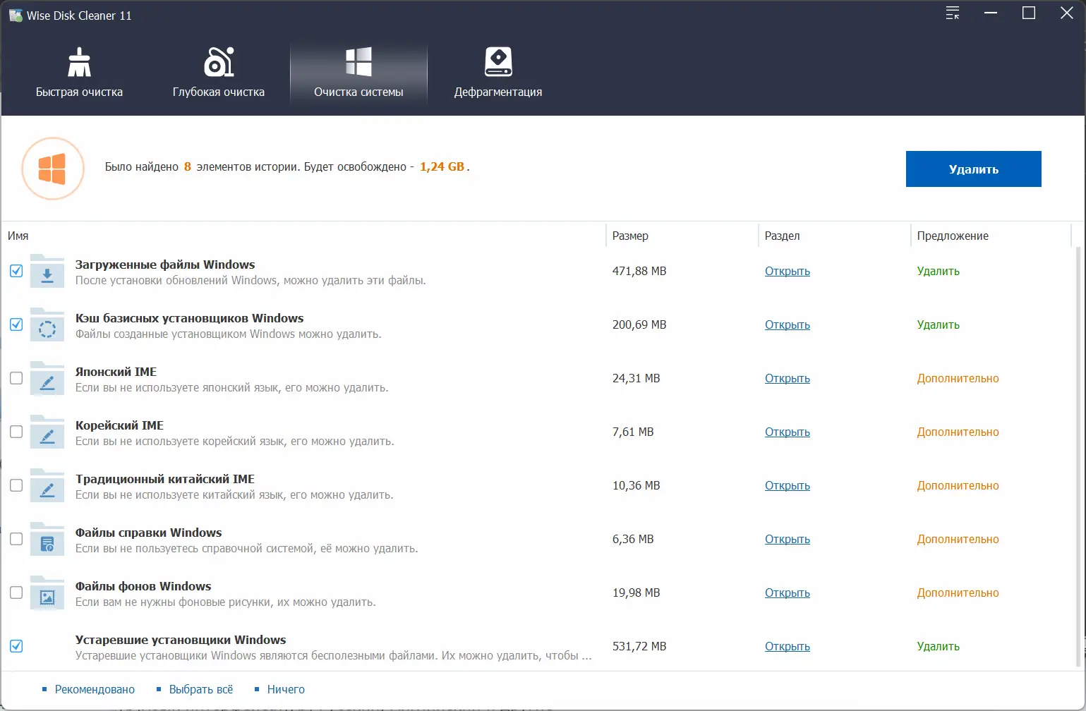 - Настройка параметров очистки для разных типов системных мусоров