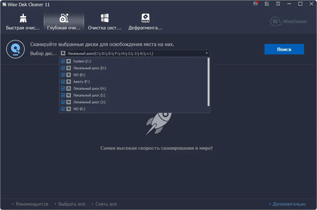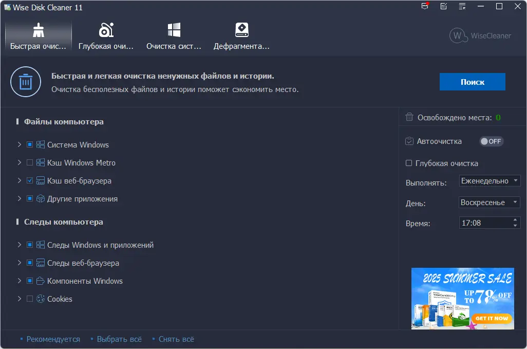 Wise Disk Cleaner — это эффективная утилита для очистки дисков от временных, ненужных и остаточных файлов, способная повысить производительность системы и освободить дисковое пространство. Программа поддерживает более 50 форматов мусорных файлов, включая кэш браузеров, логи, дампы памяти и остатки удалённых приложений. Работа с интерфейсом интуитивно понятна, не требует технических знаний и подходит как новичкам, так и опытным пользователям.