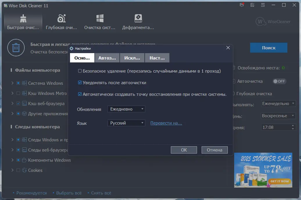- Возможность настройки расписания для автоматической очистки.