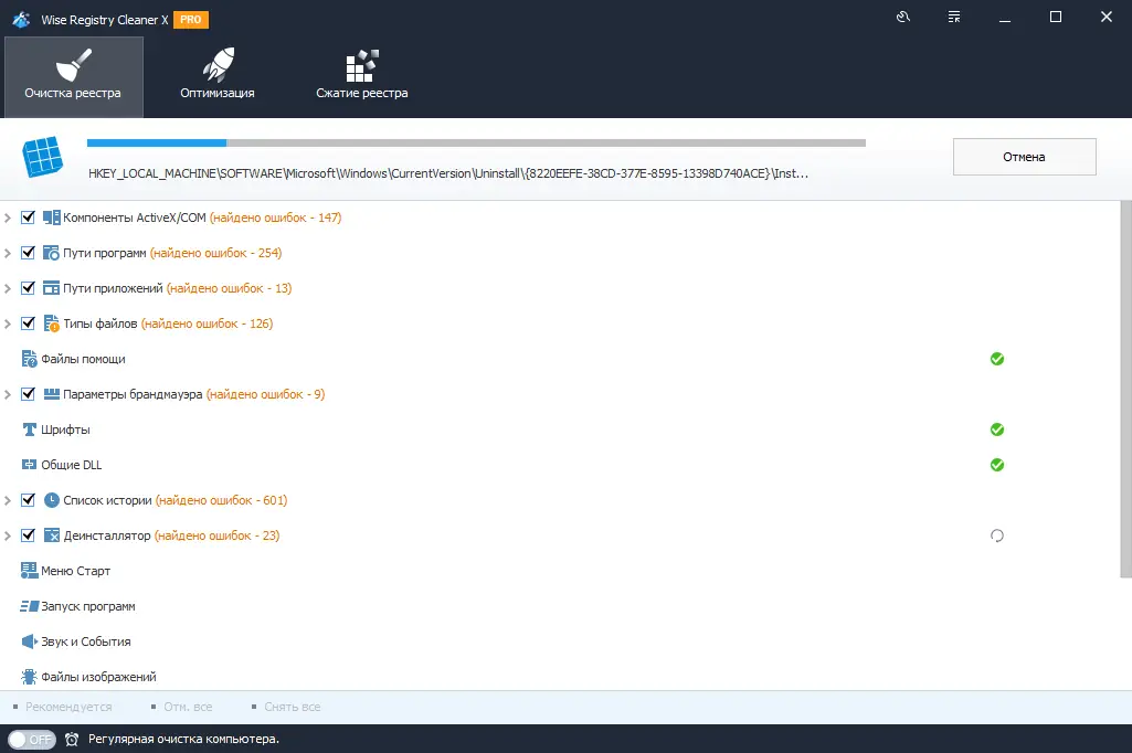 - Осуществляет детальное сканирование всех веток реестра на наличие ошибок и устаревших записей.