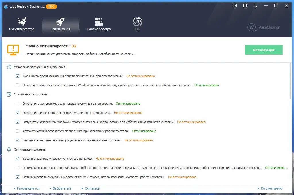 - Оптимизирует параметры реестра для ускорения запуска Windows и работы интернета.