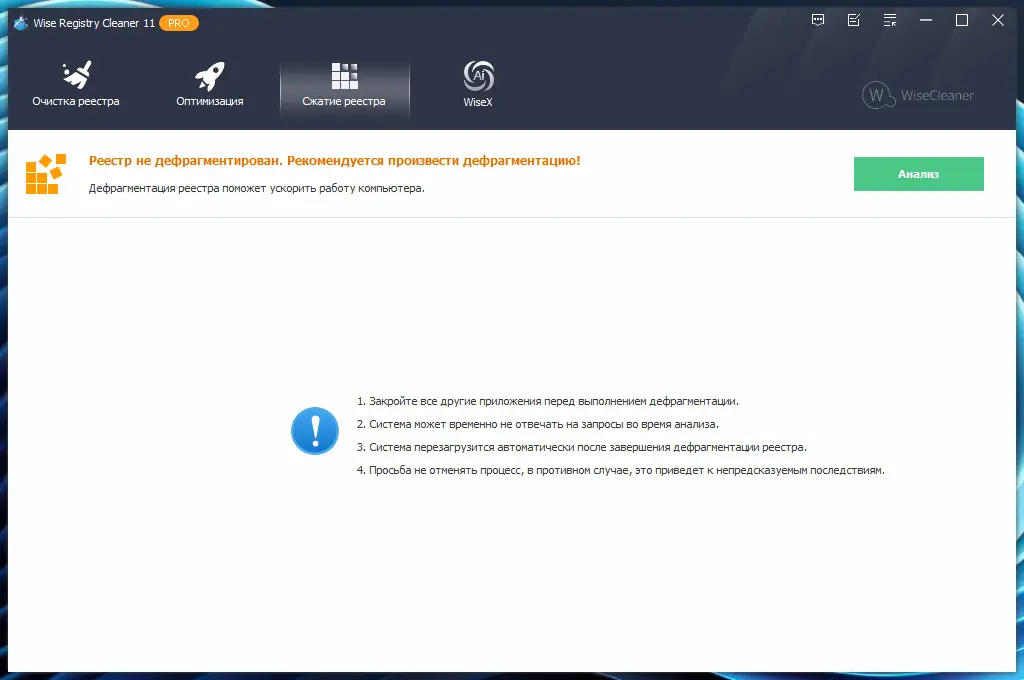 - Доступна функция дефрагментации реестра, которая упорядочивает его структуру для более быстрого доступа.