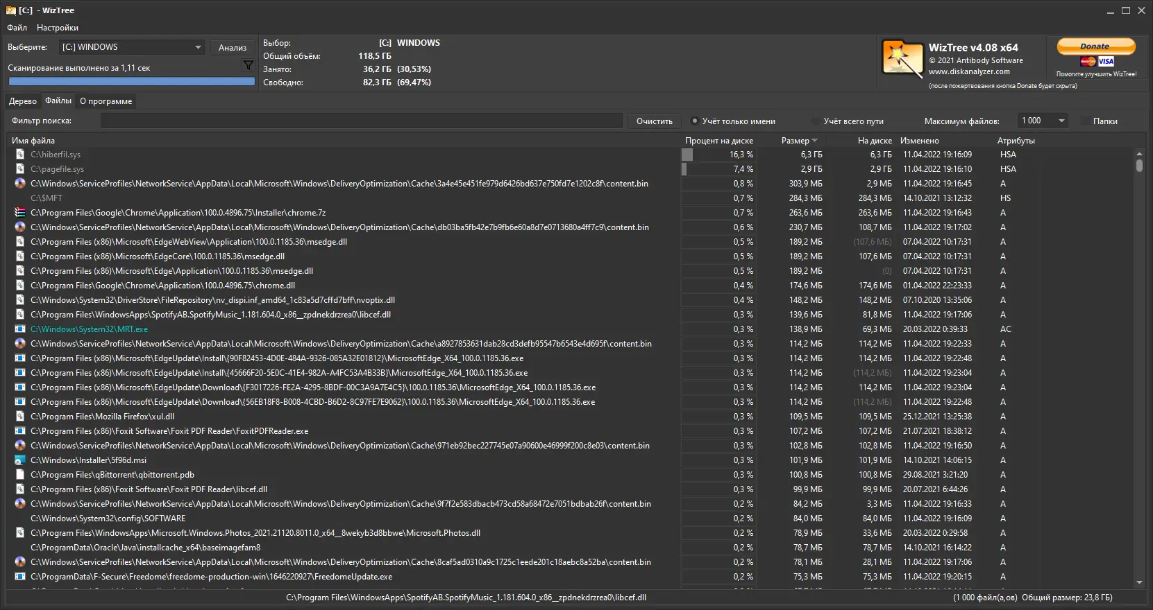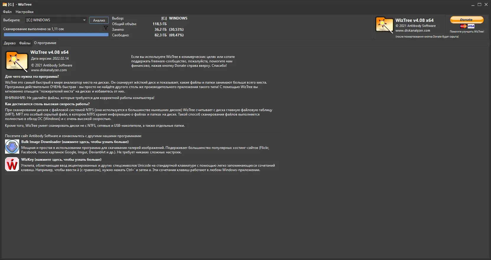 WizTree способна проанализировать диск объемом в несколько терабайт всего за несколько секунд, что делает её одной из самых быстрых утилит своего класса.