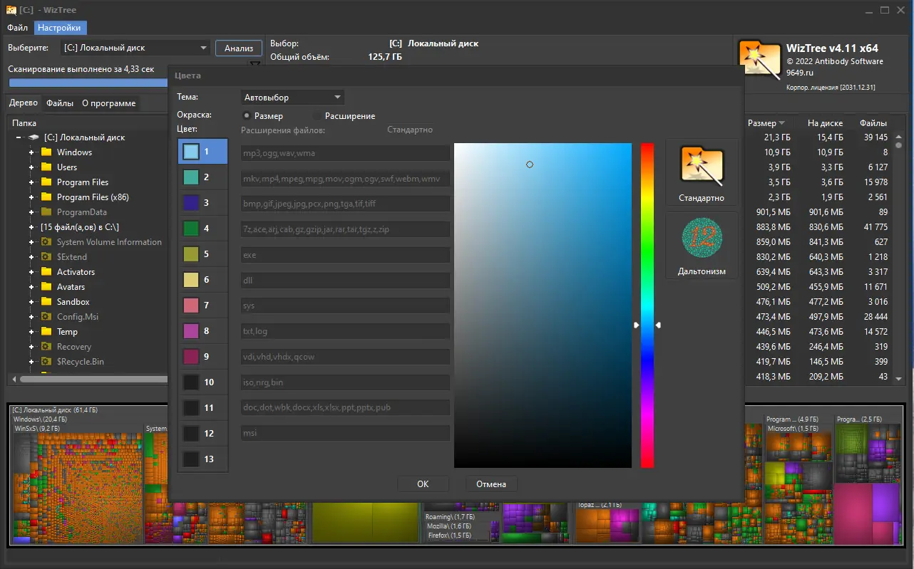WizTree — это высокоскоростная утилита для анализа дискового пространства, позволяющая быстро выявить файлы и папки, занимающие наибольший объем на жестком диске. Программа работает напрямую с файловой таблицей NTFS, обеспечивая мгновенное сканирование даже самых объемных накопителей. Интерфейс интуитивно понятен, а визуализация данных в виде тепловой карты помогает легко ориентироваться в структуре хранения.