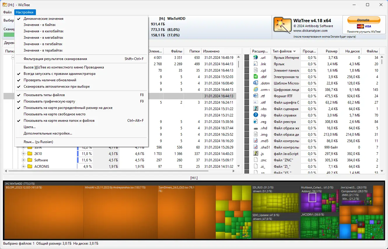 - Отображает структуру дискового пространства в виде наглядной карты-древа (Treemap)