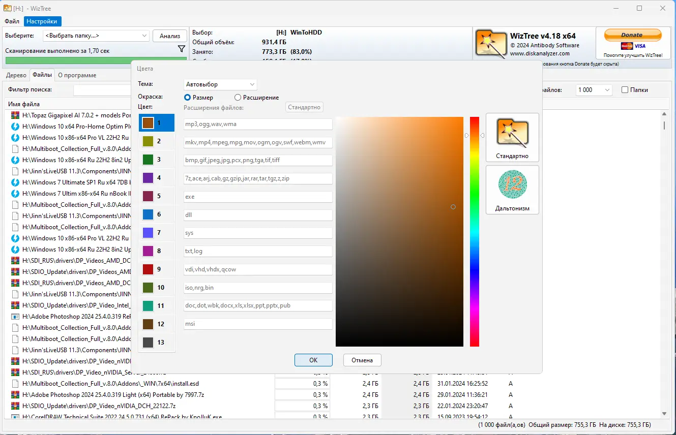 - Наглядная визуализация файлового пространства с помощью цветовой карты