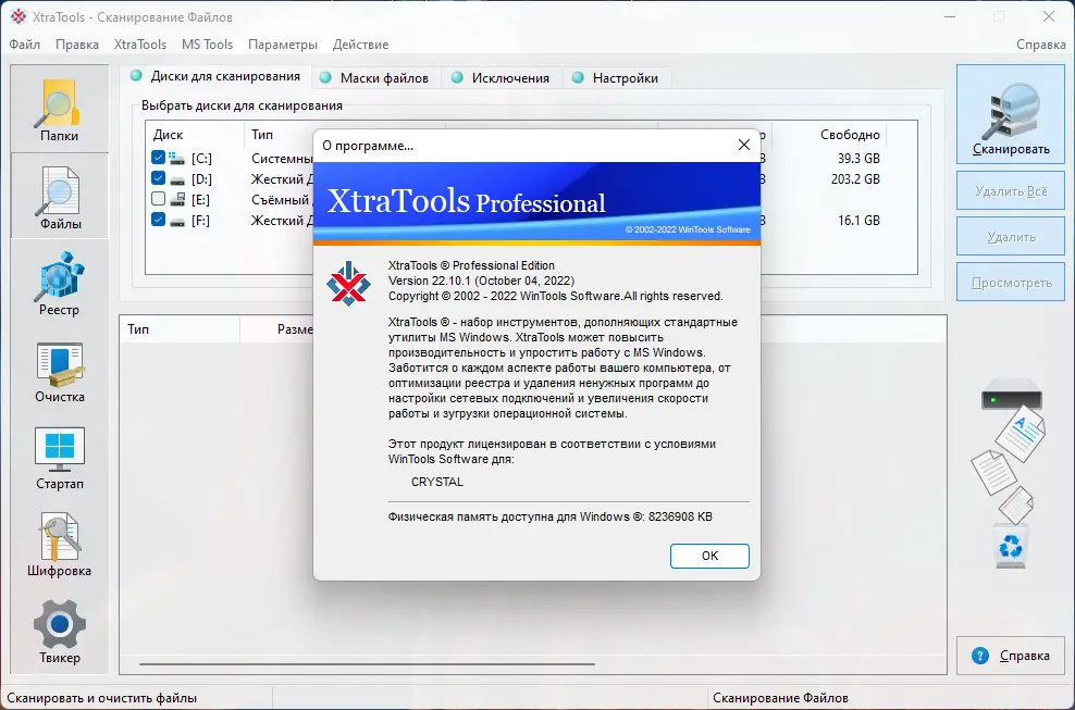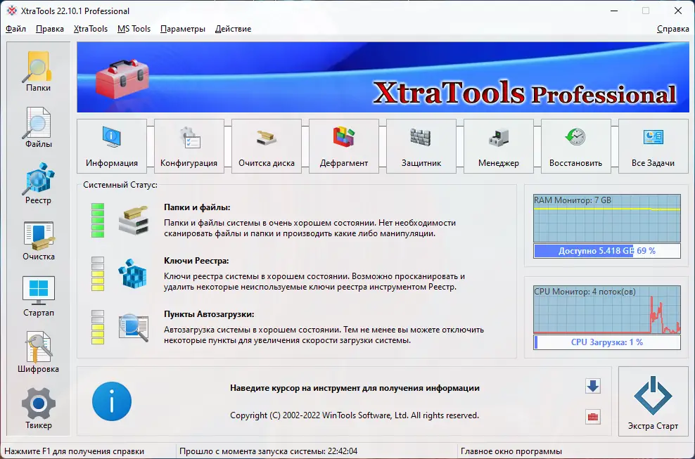 XtraTools — это многофункциональный инструмент для тонкой настройки и ускорения работы операционной системы Windows. Программа объединяет в себе набор модулей для очистки реестра, управления автозагрузкой, шифрования данных и мониторинга системных ресурсов. Она подходит как для начинающих пользователей, так и для тех, кто ищет профессиональное решение для поддержания ПК в идеальном состоянии.