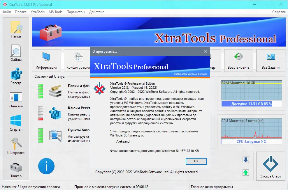 XtraTools — это многофункциональный инструмент для оптимизации операционной системы Windows, объединяющий в себе широкий спектр утилит, направленных на улучшение производительности, стабильности и безопасности компьютера. Программа помогает очищать систему от ненужных файлов, управлять автозагрузкой, шифровать данные и контролировать состояние реестра, оперативной памяти и системных процессов. Благодаря компактности и простоте интерфейса, XtraTools подходит как новичкам, так и опытным пользователям, стремящимся к эффективной настройке своего ПК.