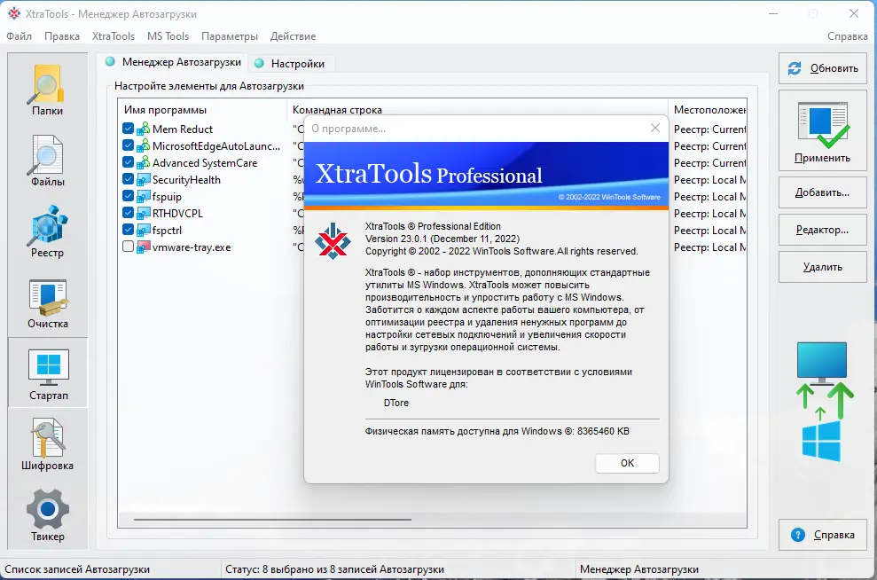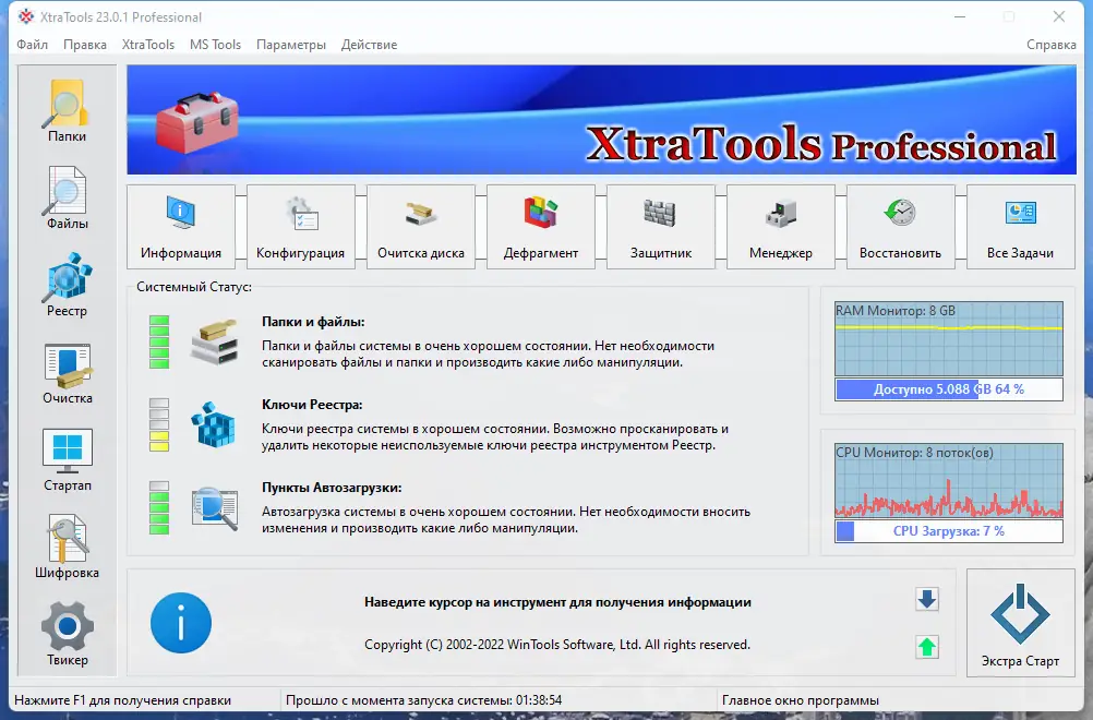 XtraTools — это многофункциональный инструмент для глубокой оптимизации и настройки операционной системы Windows, объединяющий в себе набор утилит для контроля производительности, очистки системы и управления автозагрузкой. Программа помогает ускорить работу компьютера, освободить дисковое пространство, повысить стабильность системы и защитить конфиденциальные данные от постороннего доступа. Благодаря модульному подходу каждый компонент решает конкретную задачу, обеспечивая комплексный уход за системой без необходимости установки множества сторонних приложений.