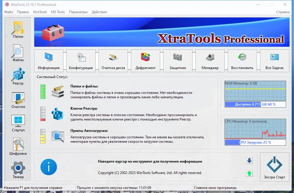XtraTools — многофункциональная утилита для глубокой оптимизации и обслуживания операционной системы Windows, обеспечивающая стабильность, высокую производительность и безопасность. Программа объединяет в себе набор инструментов для очистки реестра, управления автозагрузкой, шифрования файлов и мониторинга системных ресурсов.
