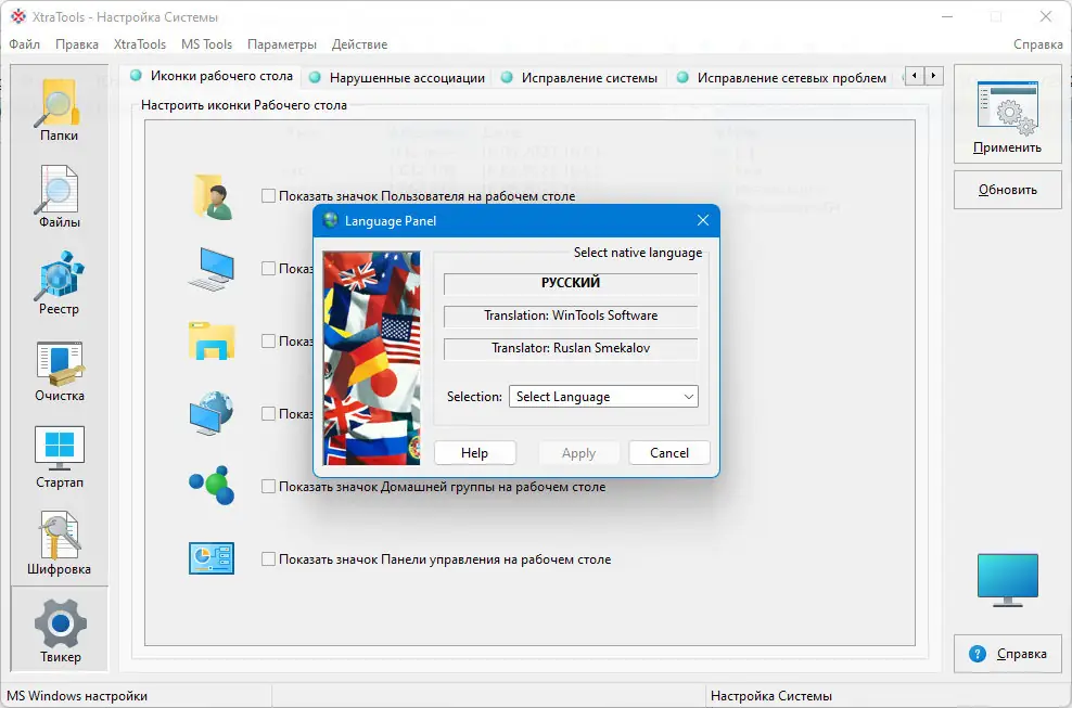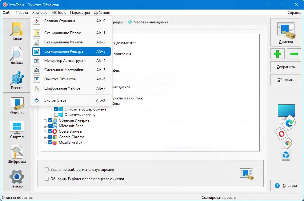 Использование XtraTools не требует технической подготовки. После установки программа отображает основной интерфейс с перечнем доступных инструментов. Каждый модуль работает автономно, что позволяет запускать только нужные функции. Например, для очистки реестра выбирается соответствующий сканер, который проводит анализ и предлагает удалить неверные или устаревшие записи. Аналогично работает очистка папок и файлов — пользователь указывает пути, а система выполняет проверку на наличие ненужных данных. Модуль Objects Eraser помогает удалить следы активности, включая историю браузеров и недавние документы, что особенно актуально при использовании общего компьютера. Для настройки автозагрузки предусмотрен удобный менеджер, где можно включать или отключать приложения одним кликом. Смена языка интерфейса осуществляется через раздел Options → Language → russian.lng, что обеспечивает комфортную работу для русскоязычных пользователей.