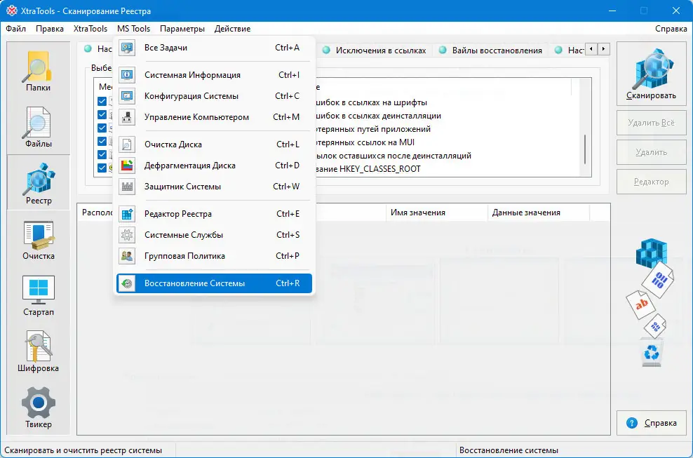 - Функция сканирования реестра устраняет устаревшие записи и битые ссылки, что положительно сказывается на скорости запуска системы.