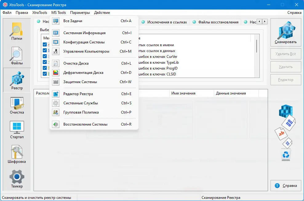 - Инструмент Scan Registry сканирует реестр Windows на наличие ошибок, устаревших записей и неверных ссылок, что положительно сказывается на скорости запуска системы.