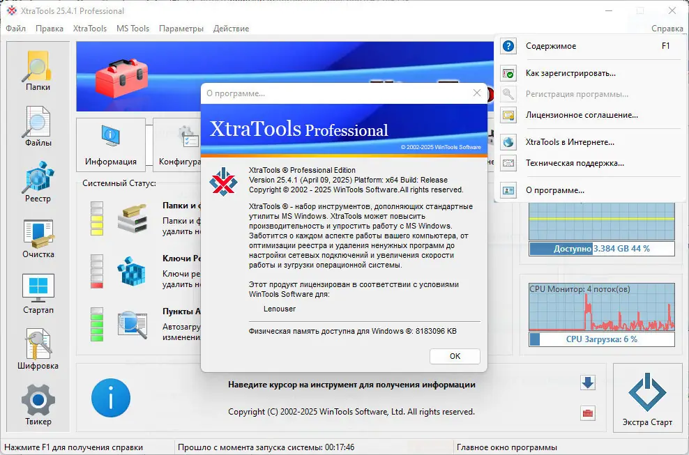 XtraTools — это мощный и многофункциональный инструмент для комплексной оптимизации операционной системы Windows. Программа объединяет в себе набор утилит, направленных на ускорение работы компьютера, очистку системы от мусора, шифрование данных и тонкую настройку параметров автозагрузки. Подходит как для новичков, так и для опытных пользователей, стремящихся поддерживать систему в идеальном состоянии.