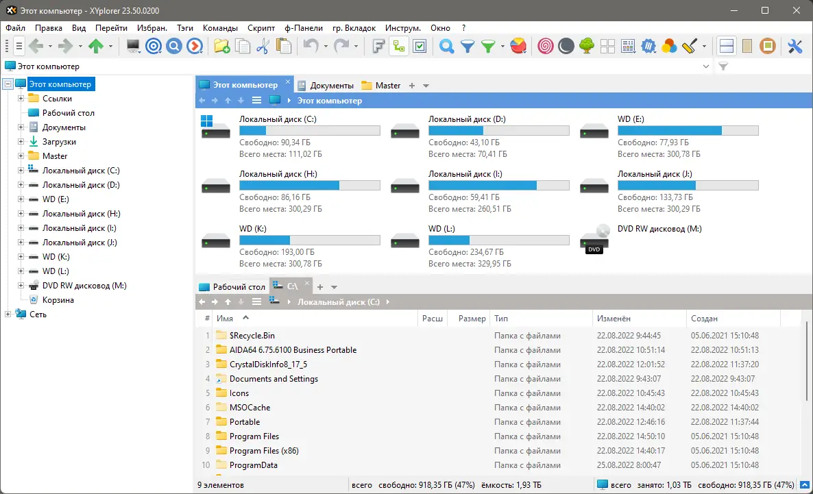 XYplorer предлагает продвинутый подход к управлению файлами, обеспечивая высокую производительность и гибкость в работе с данными. Программа поддерживает открытие множества папок в отдельных вкладках, что упрощает одновременную работу с разными каталогами. Интерфейс можно детально настроить: изменить цветовую схему, расположение панелей, добавить пользовательские инструменты и горячие клавиши. Это делает навигацию более персонализированной и эффективной.