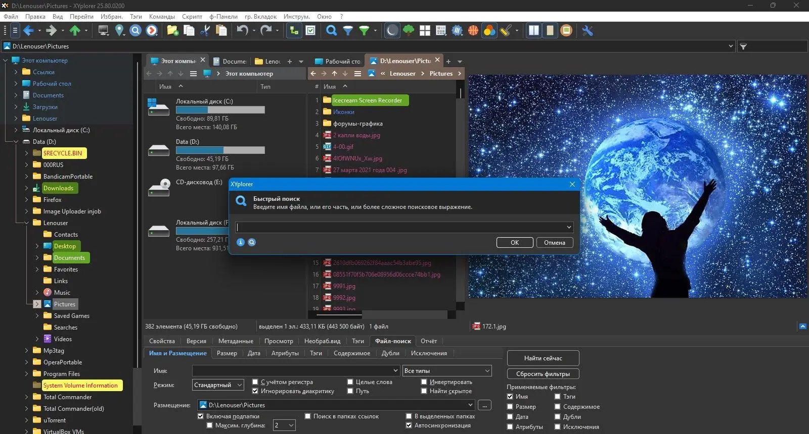 XYplorer — это многовкладочный файловый менеджер с расширенными возможностями для эффективной работы с файлами и папками в операционной системе Windows. Программа предлагает гибкую настройку интерфейса, поддержку портативного режима и широкий набор инструментов, превосходящих функционал стандартного проводника. Благодаря интуитивной структуре и высокой производительности, XYplorer становится незаменимым решением для пользователей, стремящихся к удобной и быстрой навигации по файловой системе.