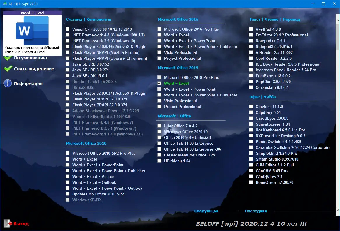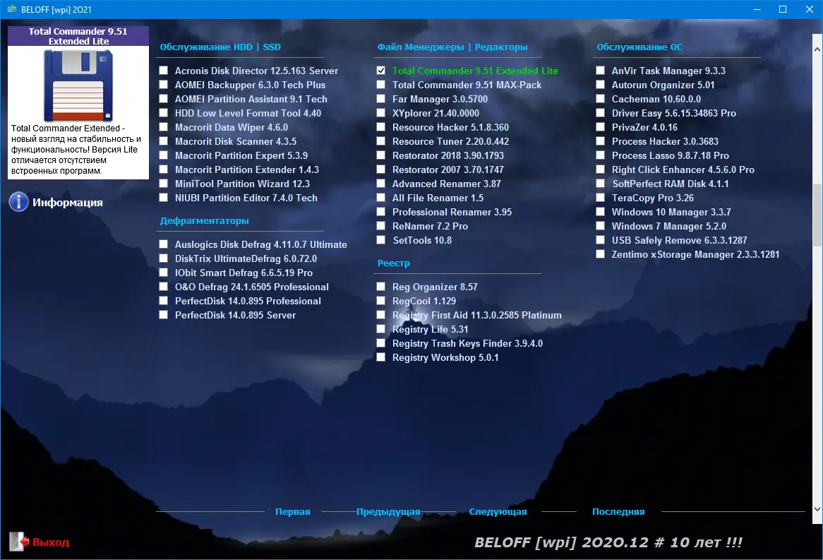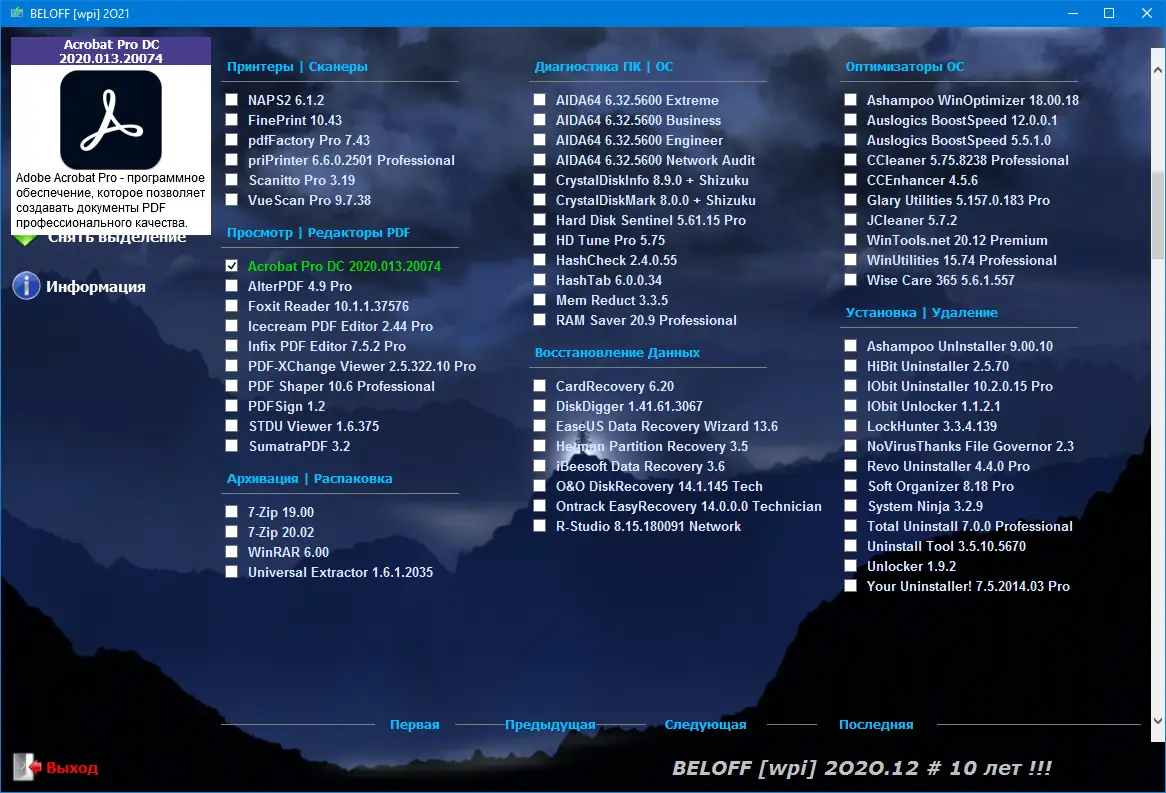 BELOFF — это универсальный сборник лучших программ Рунета с автоматической установкой на компьютеры под управлением Windows. В архиве представлены тысячи приложений, распределённых по категориям, включая офисные пакеты, мультимедиа, утилиты, драйверы и инструменты для обслуживания системы. Сборка поддерживает как полноценную установку через WPI, так и использование портативных версий программ с USB-накопителей. В комплекте — автоматическая инсталляция компонентов, драйверов и мультизагрузочная среда для восстановления системы.