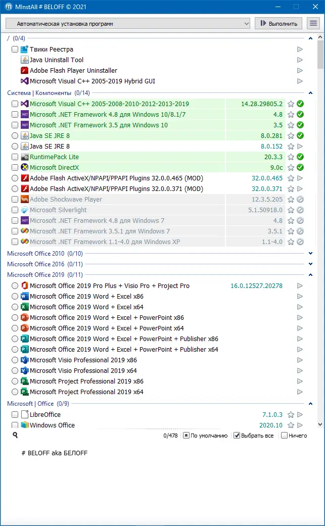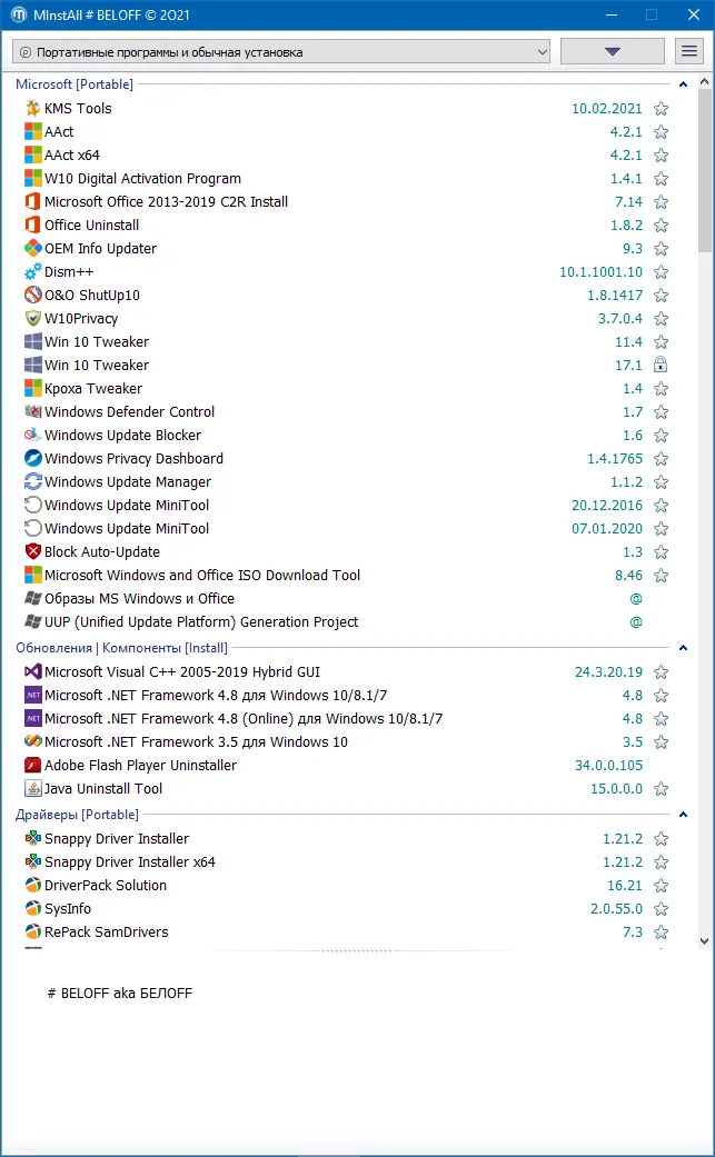 BELOFF — универсальный сборник лучших программ Рунета с автоматической установкой через WPI и MInstAll, включающий офисные, мультимедийные, системные и портативные приложения для Windows. Сборка поддерживает установку драйверов через Snappy Driver Installer и DriverPack Solution, а также предлагает мультизагрузочную среду WinPE для обслуживания системы. Программы распределены по категориям, что упрощает выбор и установку необходимого софта.