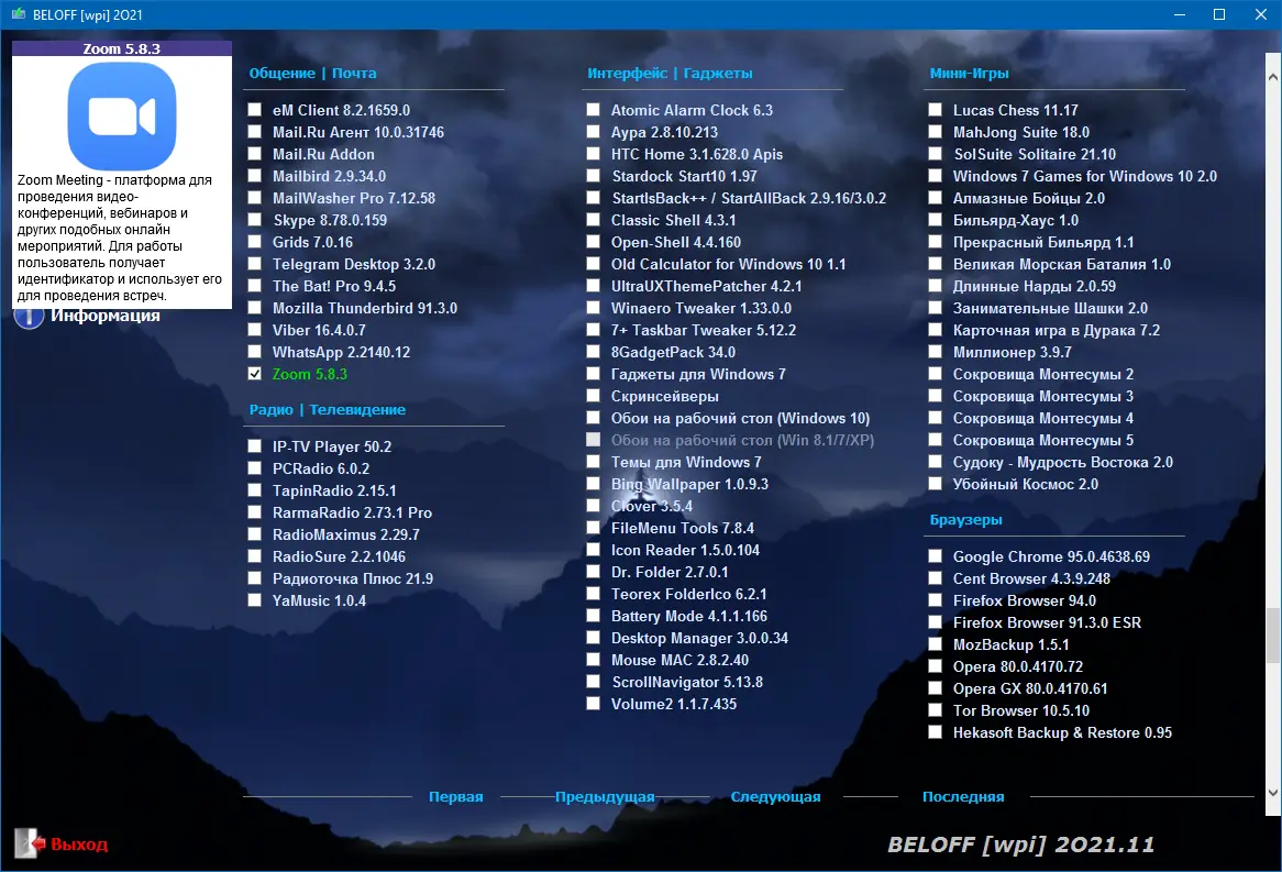 BELOFF представляет собой комплексное программное обеспечение, объединяющее множество полезных утилит, приложений и системных инструментов. Все компоненты тщательно отобраны и сгруппированы по тематическим разделам, что упрощает поиск и установку нужного софта. Сборка поддерживает автоматическое развёртывание программ через систему WPI, что обеспечивает высокую степень контроля и гибкость при настройке.