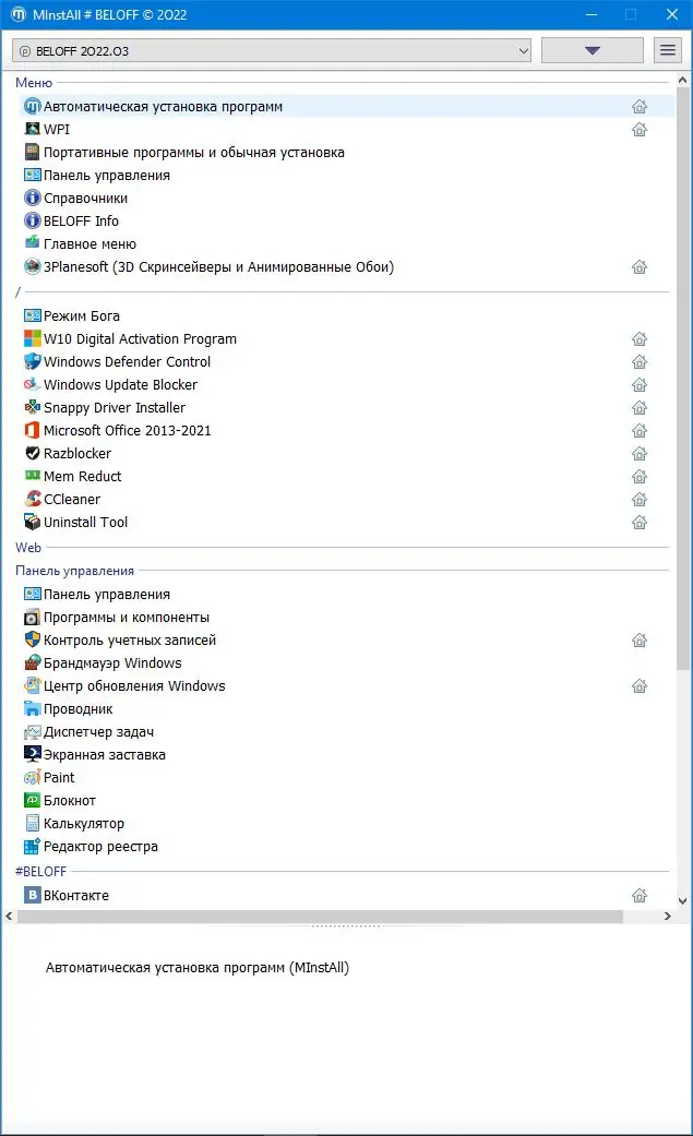 BELOFF — это универсальный сборник лучших программ Рунета, объединяющий сотни приложений, распределённых по категориям и готовых к автоматической установке на компьютеры под управлением Windows. В комплект входят офисные пакеты, графические редакторы, утилиты для обслуживания системы, драйверы, мультимедиа-приложения и многое другое. Сборка поддерживает как обычную, так и портативную установку, а также включает в себя мультизагрузочное меню для BIOS и UEFI, что делает её незаменимой для настройки и восстановления ПК. Программы устанавливаются через WPI и MInstAll, обеспечивая удобный и быстрый запуск процесса.
