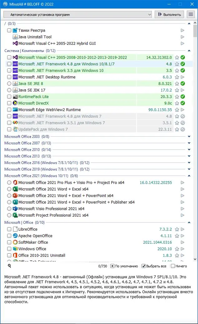 BELOFF представляет собой комплексное решение для пользователей, которым требуется широкий спектр программного обеспечения без необходимости поиска и ручной установки каждого приложения. Сборка регулярно обновляется и включает в себя как базовые компоненты, необходимые для работы системы, так и специализированные инструменты для администрирования, дизайна, резервного копирования и восстановления данных. Все компоненты тщательно подобраны и перепакованы для совместимости и удобства установки. Особое внимание уделено автоматизации процесса — пользователь может выбрать нужные программы и запустить установку в несколько кликов.