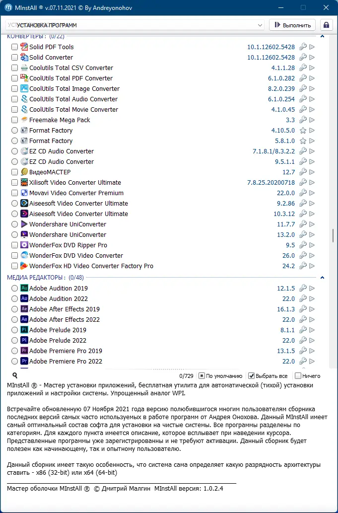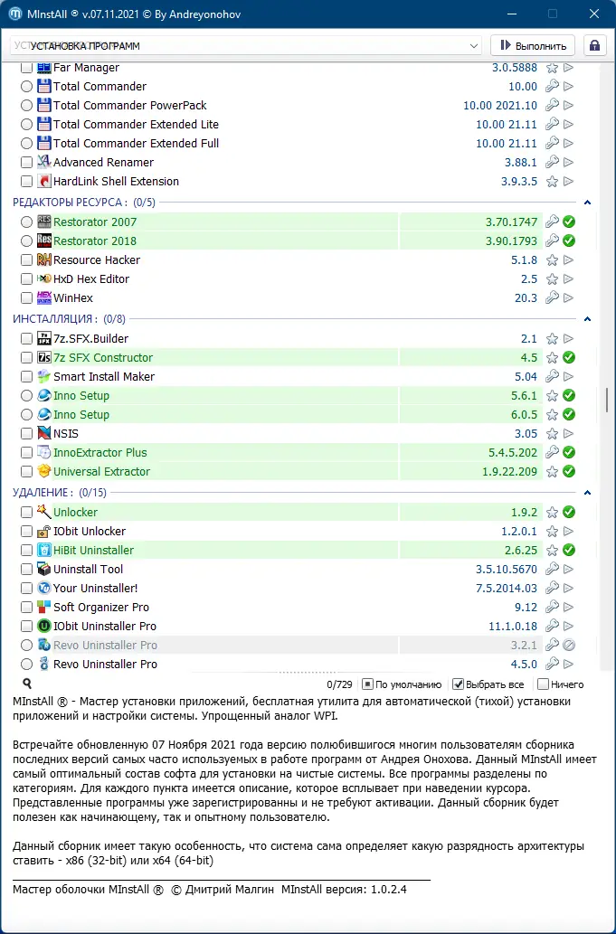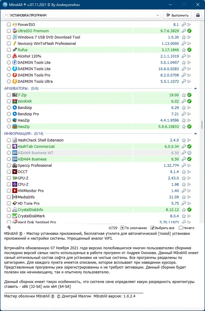 MInstAll — это универсальная сборка программного обеспечения, собранная Андреем Оноховым, предназначенная для быстрой и удобной установки необходимых приложений на чистую операционную систему. Версия от 07 ноября 2021 года включает в себя обновлённые дистрибутивы, оптимизированную оболочку и полный набор офисных, мультимедийных, системных и интернет-приложений. Все программы предварительно зарегистрированы, не требуют дополнительной активации и устанавливаются в автоматическом режиме. Сборка занимает 130 ГБ и доступна для скачать через торрент.