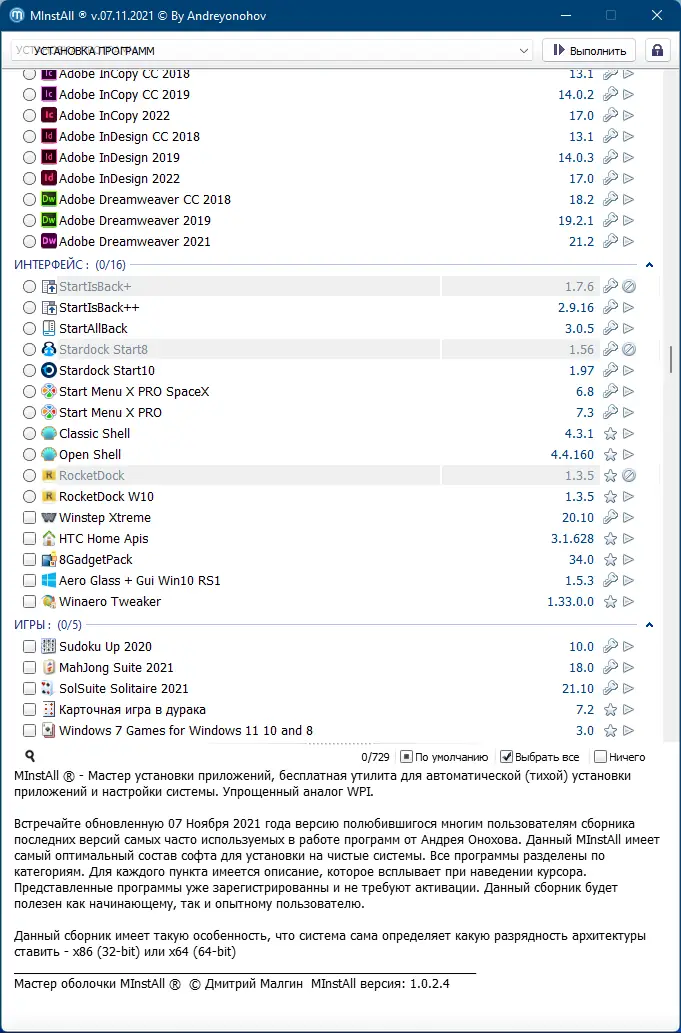 Каждое приложение в MInstAll сопровождается всплывающим описанием, которое отображается при наведении курсора, что упрощает выбор нужного софта.