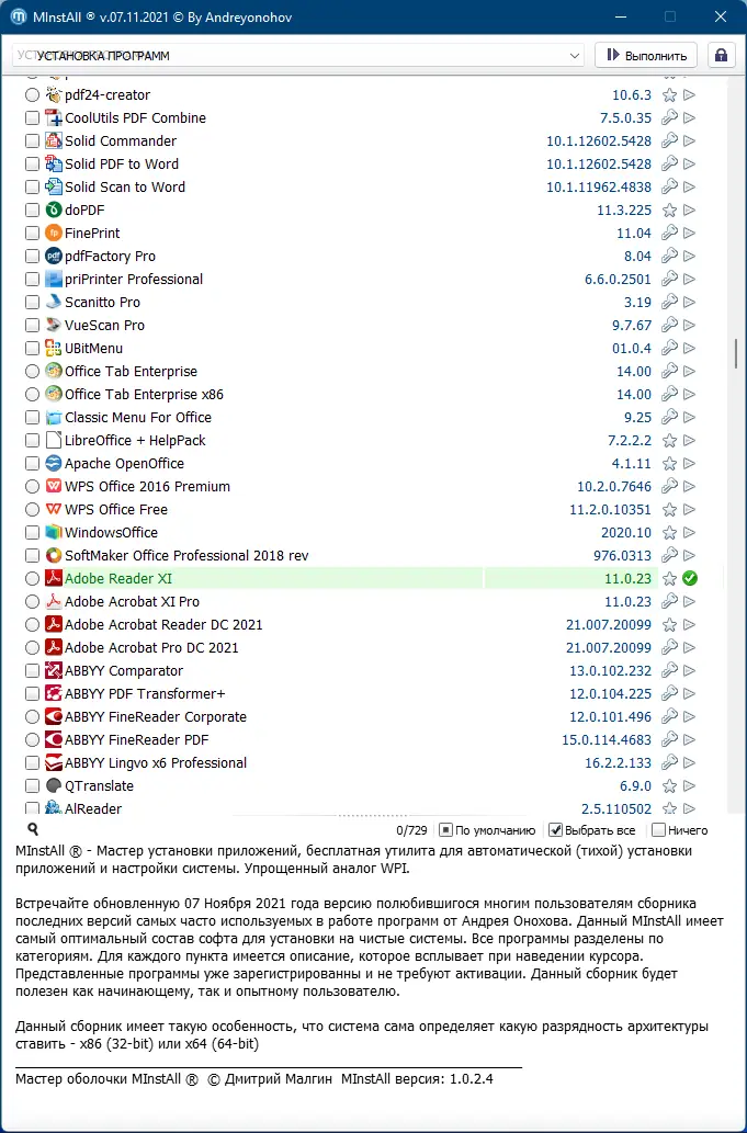 MInstAll — это универсальный сборник программного обеспечения для быстрой и удобной установки на чистую операционную систему. Обновлённый 07 ноября 2021 года, он предлагает широкий выбор актуальных приложений, объединённых в новой, упрощённой оболочке. Сборка включает в себя уже зарегистрированные версии софта, что исключает необходимость активации. Подходит как для домашнего, так и для профессионального использования.