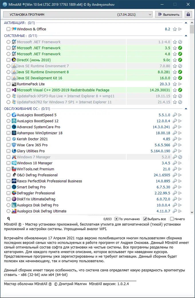 Перед вами обновлённая 17 апреля 2021 года версия популярного сборника программ MInstAll — удобного инсталлятора часто используемых приложений от Андрея Онохова. Новая версия предлагает переработанную оболочку, автоматическое определение разрядности системы и тщательно подобранный софт для чистых установок Windows. Все программы предварительно активированы, что упрощает процесс настройки компьютера.