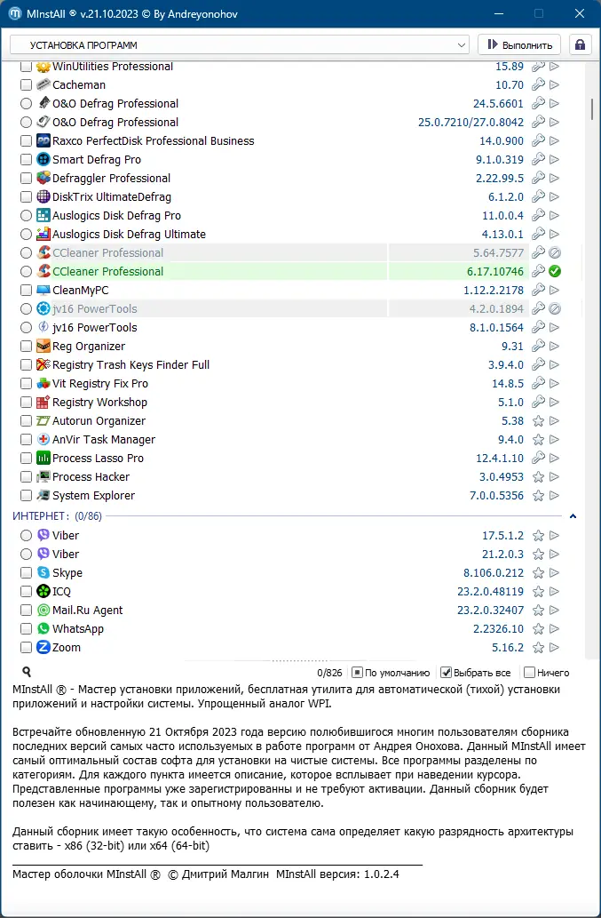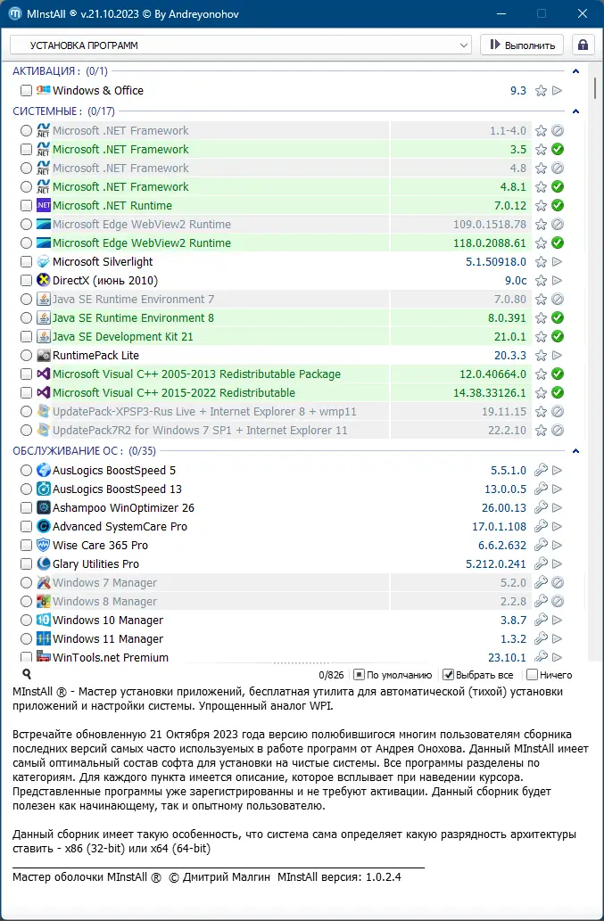 MInstAll — это комплексное решение для тех, кто часто переустанавливает операционную систему или настраивает несколько компьютеров. Сборка создана Андреем Оноховым и представляет собой продуманную коллекцию программ, разбитых по категориям для удобного выбора. Каждый пункт в меню сопровождается описанием, которое отображается при наведении курсора. Это позволяет быстро сориентироваться даже новичку. Установка происходит в автоматическом режиме, с поддержкой как 32-битных, так и 64-битных систем.
