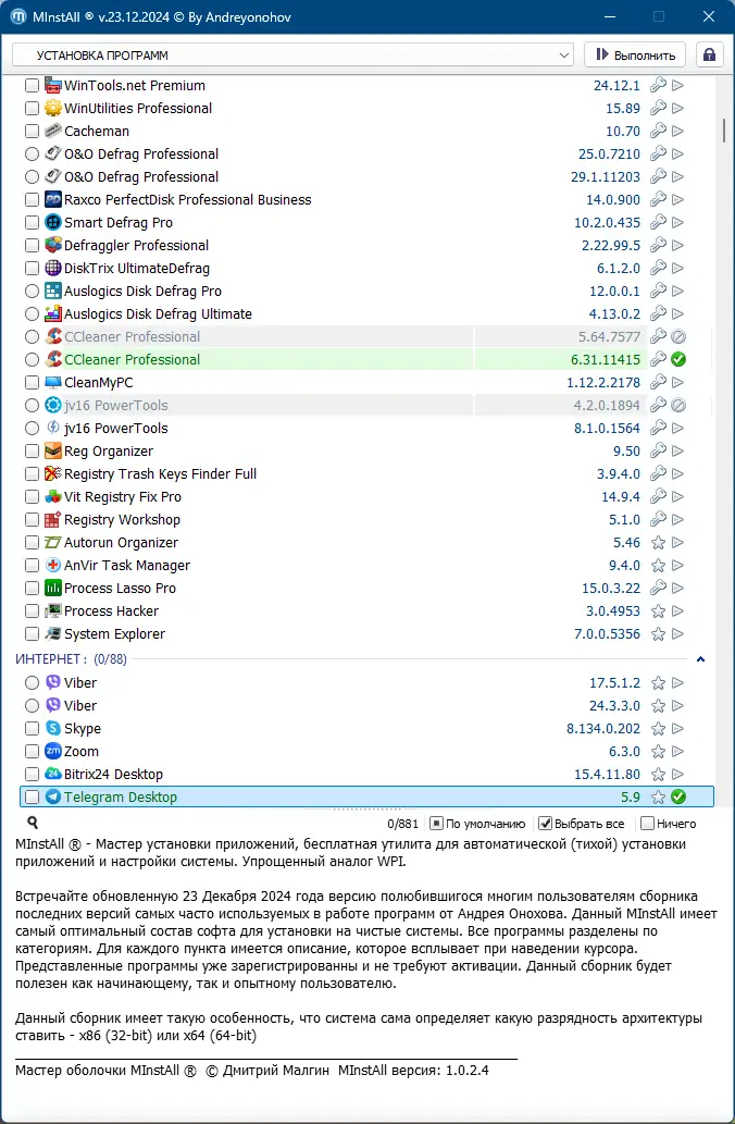 MInstAll — это универсальный сборник программного обеспечения, обновлённый 23 декабря 2024 года, предназначенный для быстрой и удобной установки необходимого софта на чистые операционные системы. Сборка создана by andreyonohov и предлагает оптимизированный набор приложений, разделённых по категориям. В комплекте — последние версии популярных утилит, офисных пакетов, графических редакторов, браузеров и инструментов для обслуживания системы. Все программы предварительно настроены и не требуют дополнительной активации. Установка осуществляется через простой мастер, совместимый с архитектурами x86 и x64.