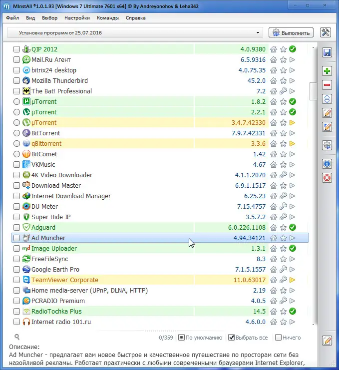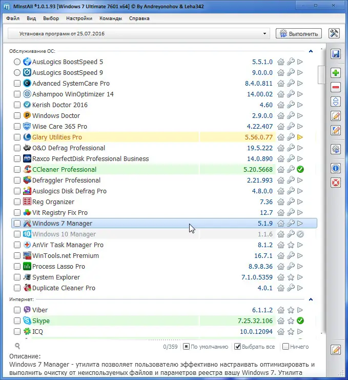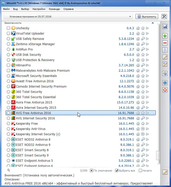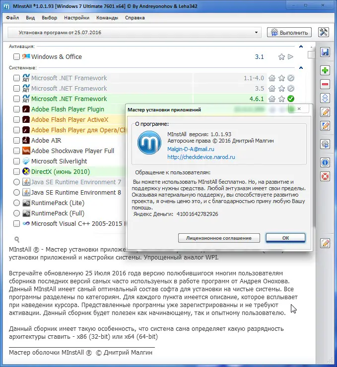 MInstAll — это универсальный сборник программного обеспечения для быстрой и удобной установки на чистую операционную систему. Обновлённая версия от 25 июля 2016 года включает в себя последние версии популярных приложений, системных утилит, офисных пакетов, графических редакторов, антивирусов и инструментов для обслуживания ПК. Сборка разработана Андреем Оноховым и представлена в виде удобного установочного мастера с поддержкой автоматического определения разрядности системы. Все компоненты уже активированы или поставляются с инструментами для лёгкой активации, что исключает необходимость поиска лицензий. Программы распределены по категориям, а при наведении на пункт установки появляется описание, упрощающее выбор. Это полноценная альтернатива WPI, ориентированная на максимальный комфорт и функциональность.