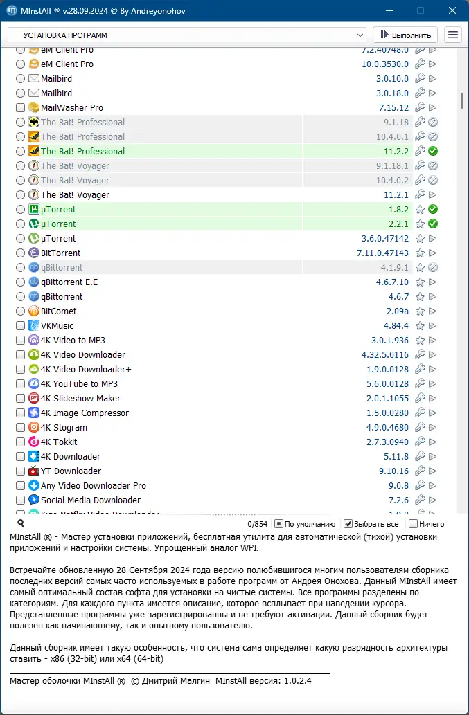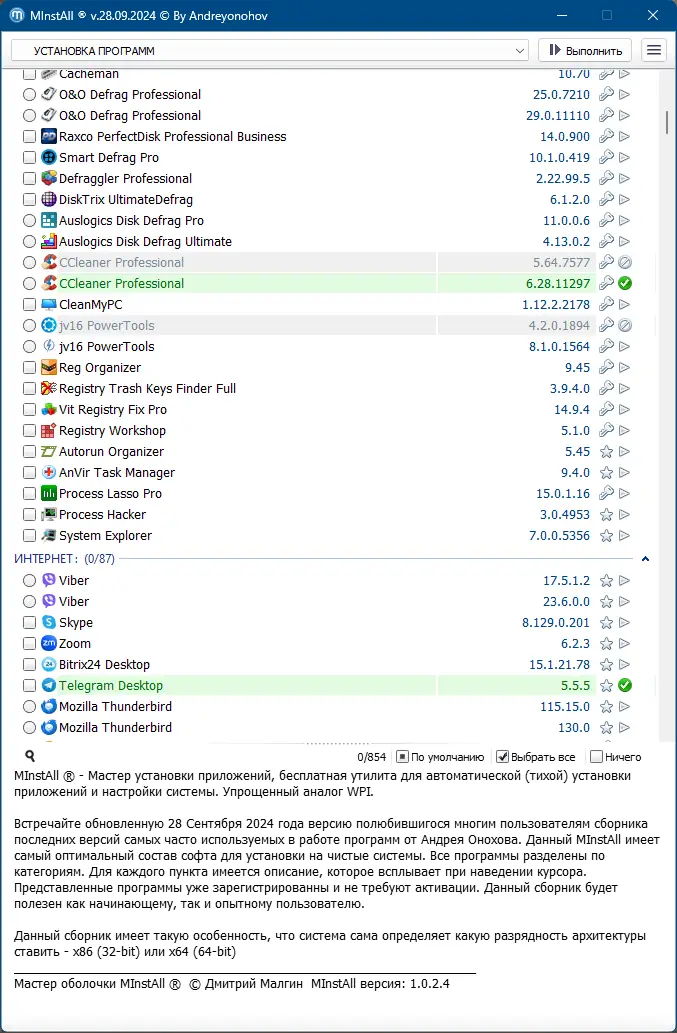 MInstAll — это универсальная сборка программного обеспечения, обновлённая 28 сентября 2024 года. В ней представлены последние версии популярных приложений, оптимизированных для быстрой установки на чистые системы. Сборка разработана Андреем Оноховым и включает в себя уже активированные программы, что исключает необходимость поиска лицензий. Интерфейс новой оболочки MInstAll стал ещё проще и удобнее, обеспечивая лёгкость навигации даже для новичков. Все компоненты распределены по категориям, а автоматическое определение разрядности системы позволяет корректно устанавливать x86 и x64 версии без ручного вмешательства.