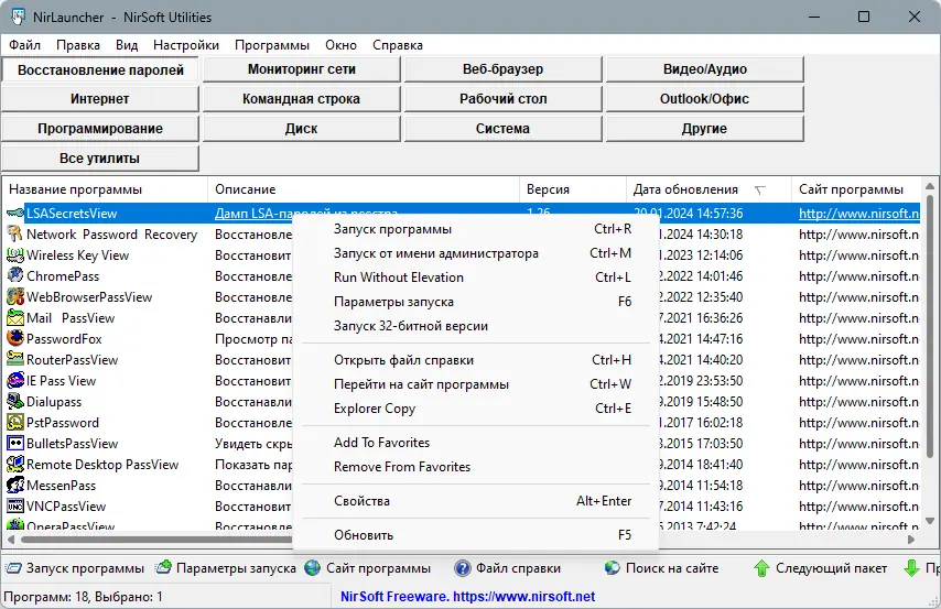 NirLauncher Package — это универсальный сборный пакет, включающий более 200 портативных утилит для диагностики, настройки и обслуживания операционной системы Windows. Все инструменты собраны в единой оболочке с интуитивным интерфейсом, что упрощает доступ к функциям восстановления паролей, анализа сети, работы с реестром, управления файлами и мониторинга системы. Программа не требует установки и подходит для использования на любом компьютере, оставаясь при этом полностью автономной.