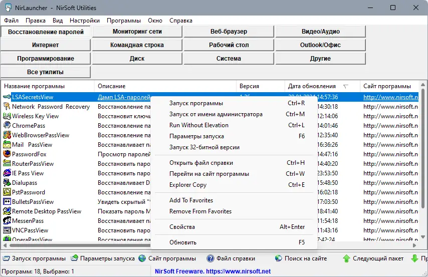 Использование NirLauncher интуитивно понятно и не требует специальных знаний. После запуска основного файла all exe откроется централизованное окно с перечнем всех доступных утилит, сгруппированных по категориям. Пользователь может воспользоваться поиском по названию или описанию, а также отсортировать список по дате обновления, размеру или функциональности. Каждая утилита запускается отдельно, а её настройки сохраняются в собственном .cfg-файле на том же носителе, что особенно удобно при работе с флешки. Также в меню предусмотрена возможность открыть справку или перейти на официальную страницу утилиты для получения дополнительной информации.