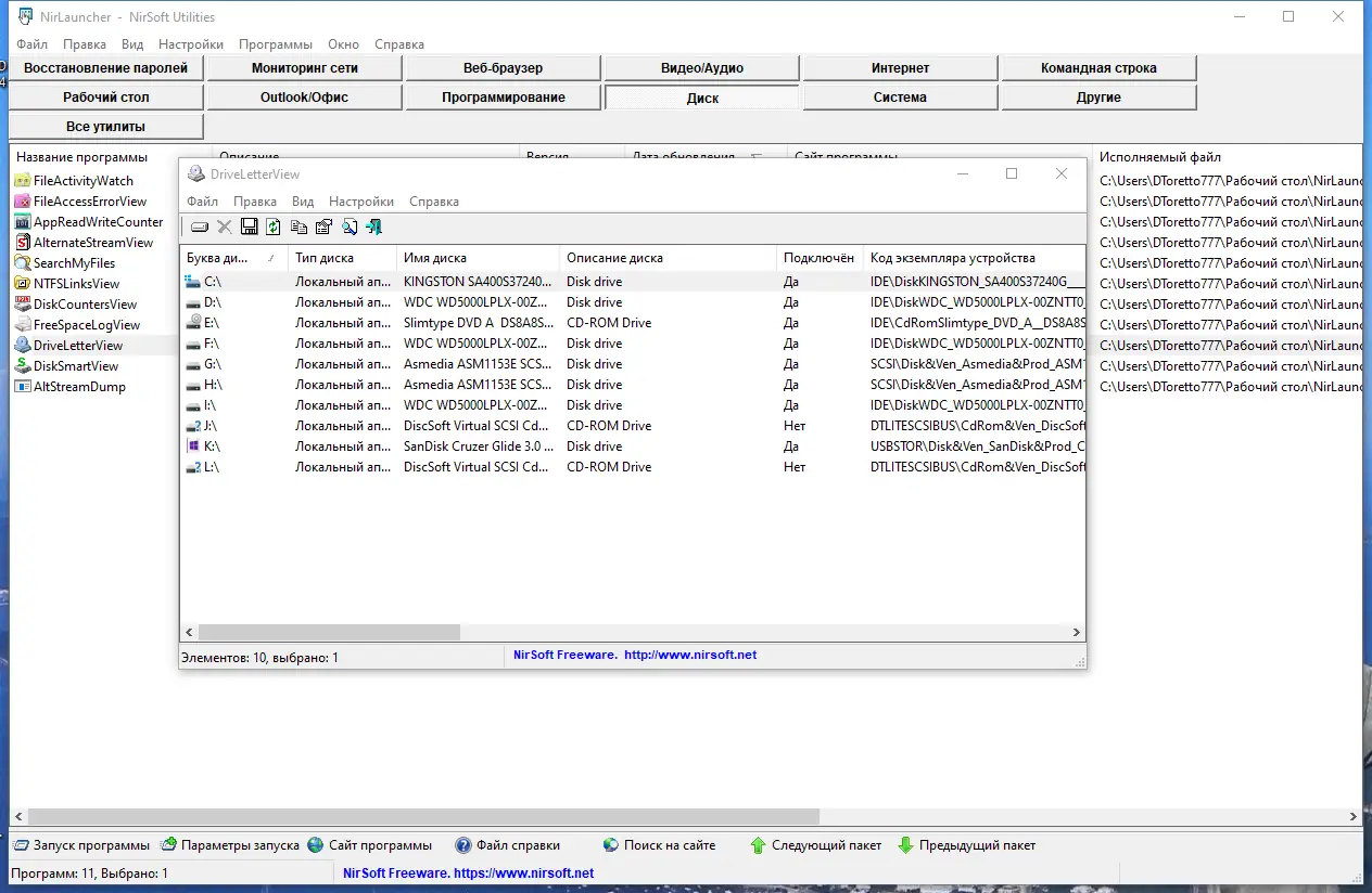 Запуск NirLauncher происходит в один клик — после извлечения архива достаточно открыть исполняемый файл. Интерфейс отображает список всех доступных утилит с кратким описанием назначения каждой. Пользователь может воспользоваться строкой поиска для быстрого нахождения нужного инструмента или отфильтровать утилиты по категориям. При запуске с флешки настройки каждой программы сохраняются в отдельный .cfg-файл, что обеспечивает сохранение предпочтений между сеансами. Для запуска утилиты достаточно дважды щёлкнуть по её названию — система автоматически определит разрядность и запустит соответствующую версию (x86 или x64).