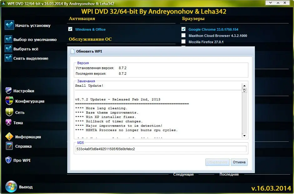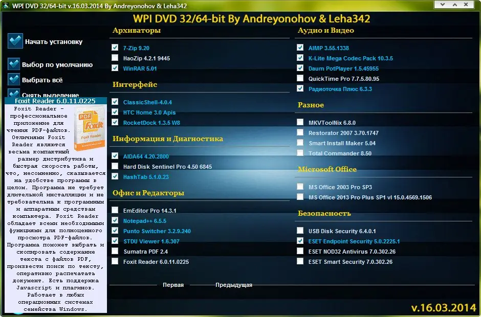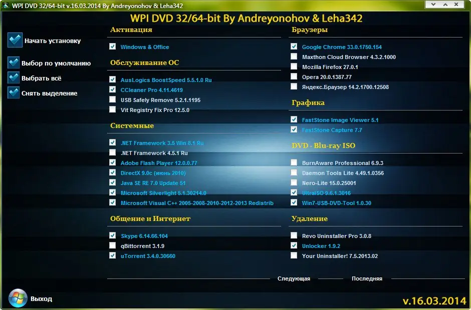 WPI DVD — это продуманная сборка программного обеспечения, созданная для упрощения настройки операционной системы после чистой установки. Комплект включает только необходимые и проверенные приложения, разделённые по категориям: офис, интернет, мультимедиа, безопасность, обслуживание системы и другие. Каждый компонент представлен в последней доступной версии на дату релиза — 16 марта 2014 года. Установка происходит в автоматическом режиме, с возможностью выбора нужных программ и отключения ненужных.