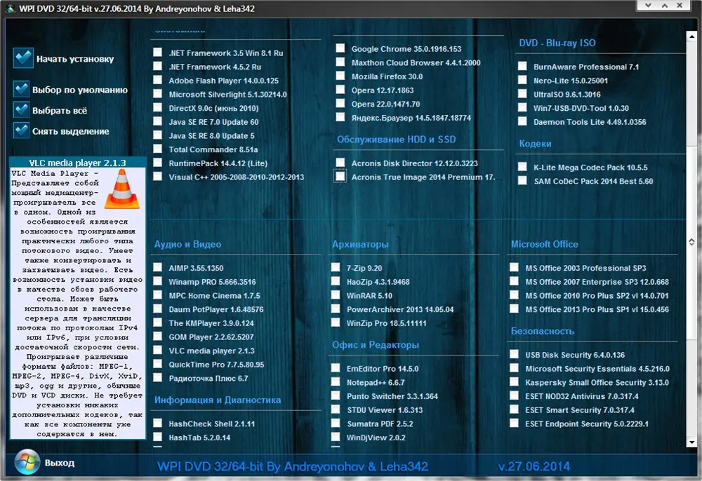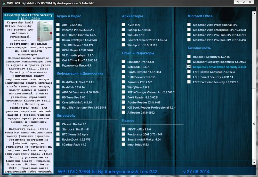 WPI DVD — это универсальный сборник программ, автоматизирующий установку необходимого софта на чистую операционную систему. В версии от 27 июня 2014 года представлены обновлённые и востребованные приложения, распределённые по категориям для удобного выбора. Интерфейс интуитивно понятен, поддерживает графические подсказки и автоматическое определение разрядности системы. Все компоненты предварительно зарегистрированы, не требуют дополнительной активации. Сборник подходит как для новичков, так и для опытных пользователей, стремящихся быстро настроить рабочее окружение.
