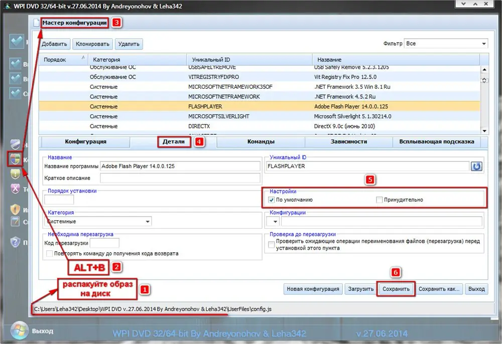 Использование сборника предельно простое: после запуска главного установочного интерфейса пользователь видит список доступных программ, сгруппированных по категориям. Для выбора нужных компонентов достаточно поставить галочки напротив интересующих пунктов. При наведении курсора на название программы отображается краткое описание и скриншот. Запуск установки начинается по нажатию кнопки «Начать». Процесс проходит в фоновом режиме, без необходимости постоянного участия пользователя. Для настройки параметров по умолчанию нужно извлечь содержимое образа на жёсткий диск и воспользоваться комбинацией клавиш Alt+B, чтобы открыть конфигурацию. В разделе «Детали» можно указать, какие программы будут выбраны автоматически при старте.