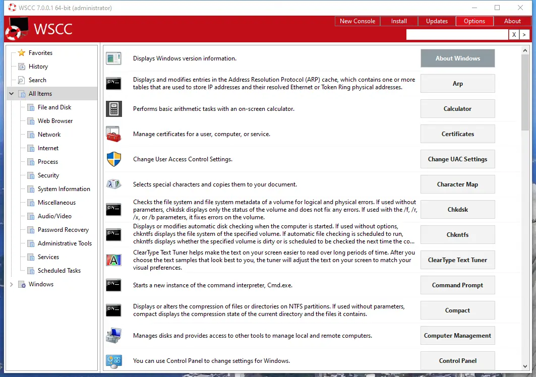 WSCC — это портативный центр управления системными утилитами для Windows, объединяющий инструменты из пакетов Sysinternals Suite и NirLauncher. Программа позволяет быстро запускать более 300 диагностических и сервисных приложений, сортировать их по категориям, добавлять в избранное и обновлять через встроенный менеджер. Интерфейс интуитивно понятен, а работа возможна без установки на компьютер.