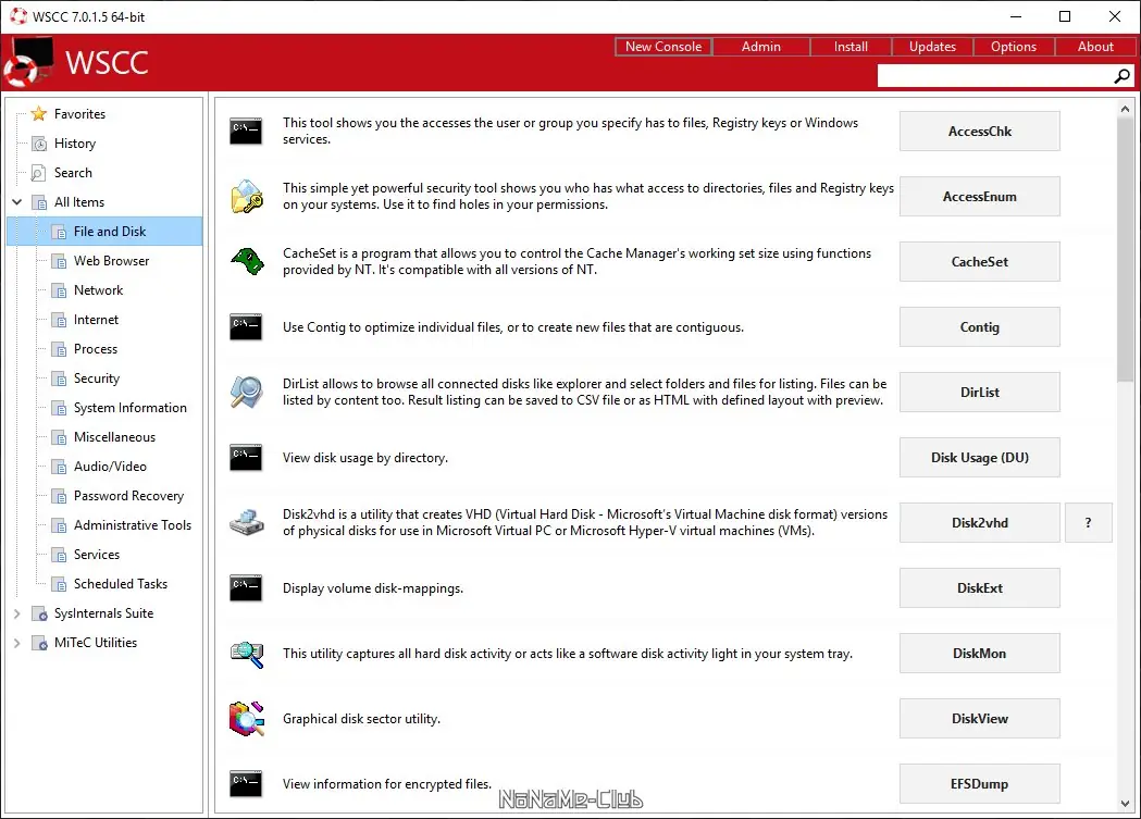 WSCC — портативная утилита для управления системой Windows, объединяющая более 300 инструментов из пакетов Sysinternals Suite и NirLauncher в едином интерфейсе с поддержкой быстрого поиска, обновлений и настройки избранного.