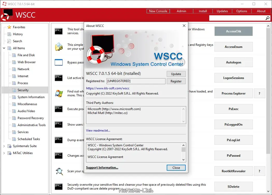 WSCC (Windows System Control Center) представляет собой удобную оболочку, объединяющую мощные диагностические и административные утилиты для операционной системы Windows. Программа включает в себя полные коллекции Sysinternals Suite от Microsoft и NirLauncher от Nir Sofer, которые тщательно организованы по категориям — от анализа процессов и реестра до управления сетевыми подключениями и восстановления данных. Благодаря портативной архитектуре, WSCC не требует установки и может запускаться с любого носителя, включая флеш-накопители, что делает её незаменимой для системных администраторов и специалистов по IT-поддержке.