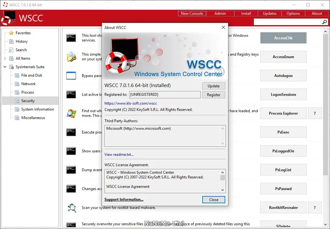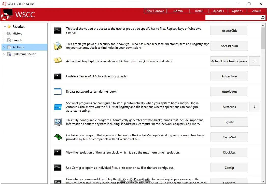 WSCC — портативный центр управления системными утилитами для Windows, объединяющий инструменты из пакетов Sysinternals Suite и NirLauncher. Программа позволяет быстро запускать, организовывать и обновлять более 300 служебных инструментов без установки на компьютер.