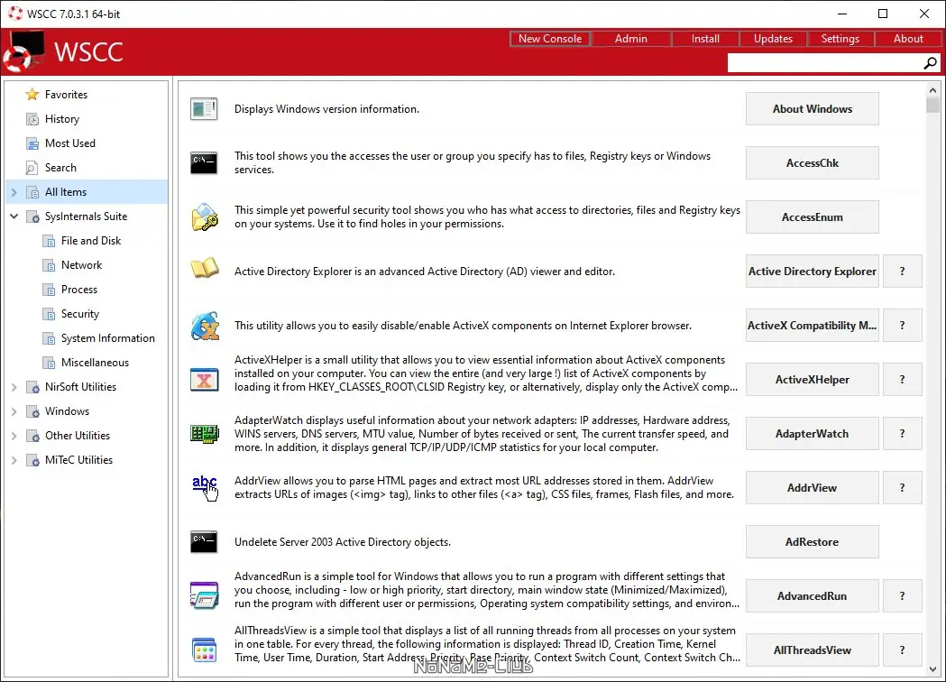 WSCC — это портативная оболочка для управления системными утилитами Windows, объединяющая инструменты из пакетов Sysinternals Suite и NirLauncher. Программа позволяет централизованно запускать более 300 служебных приложений, разделённых по категориям, и поддерживает обновление компонентов. Интерфейс включает быстрый поиск, избранное и встроенные средства диагностики операционной системы.