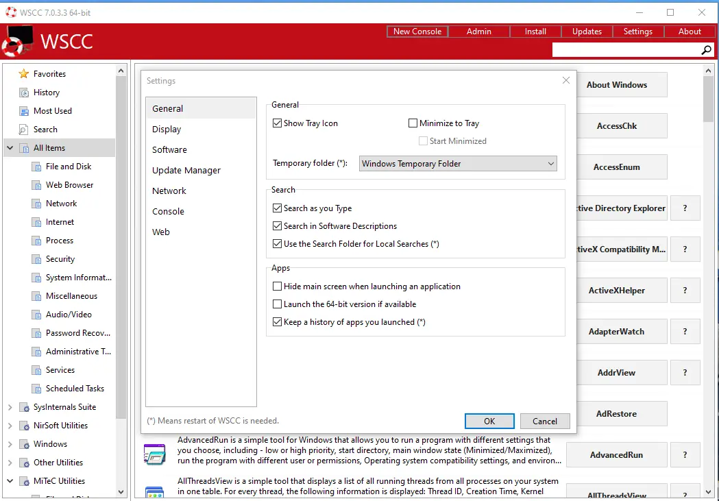 WSCC (Windows System Control Center) — портативная оболочка для управления системными утилитами, объединяющая инструменты из пакетов Sysinternals Suite и NirLauncher. Программа позволяет быстро запускать, организовывать и обновлять более 300 служебных утилит, оптимизируя диагностику и настройку операционной системы.