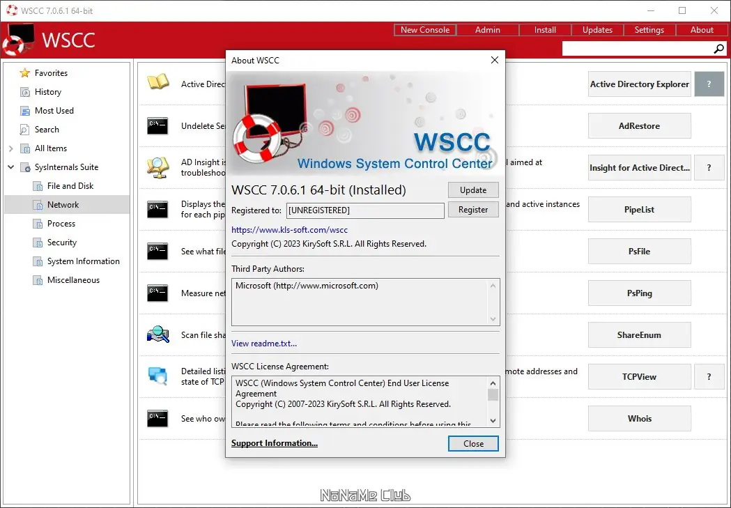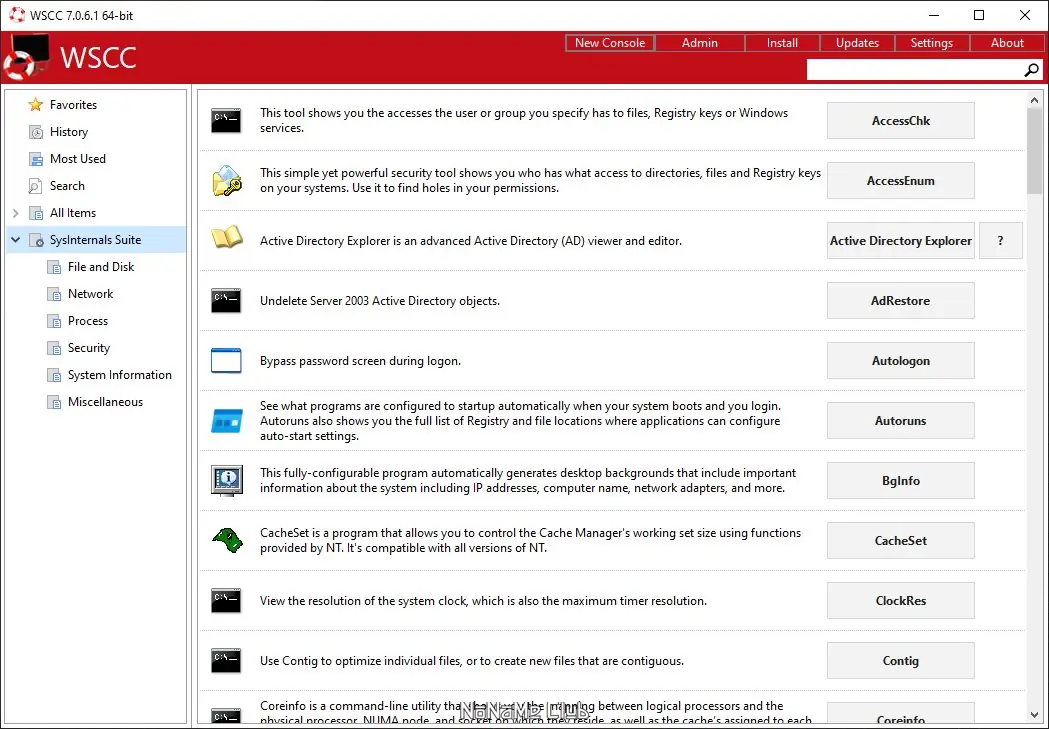 WSCC — портативная оболочка для управления системными утилитами Windows, объединяющая инструменты из пакетов Sysinternals Suite и NirLauncher. Программа позволяет быстро запускать более 300 диагностических и сервисных утилит, сгруппированных по категориям, с поддержкой обновлений и поиска. Идеальное решение для системных администраторов и пользователей, стремящихся к глубокому контролю над операционной системой.