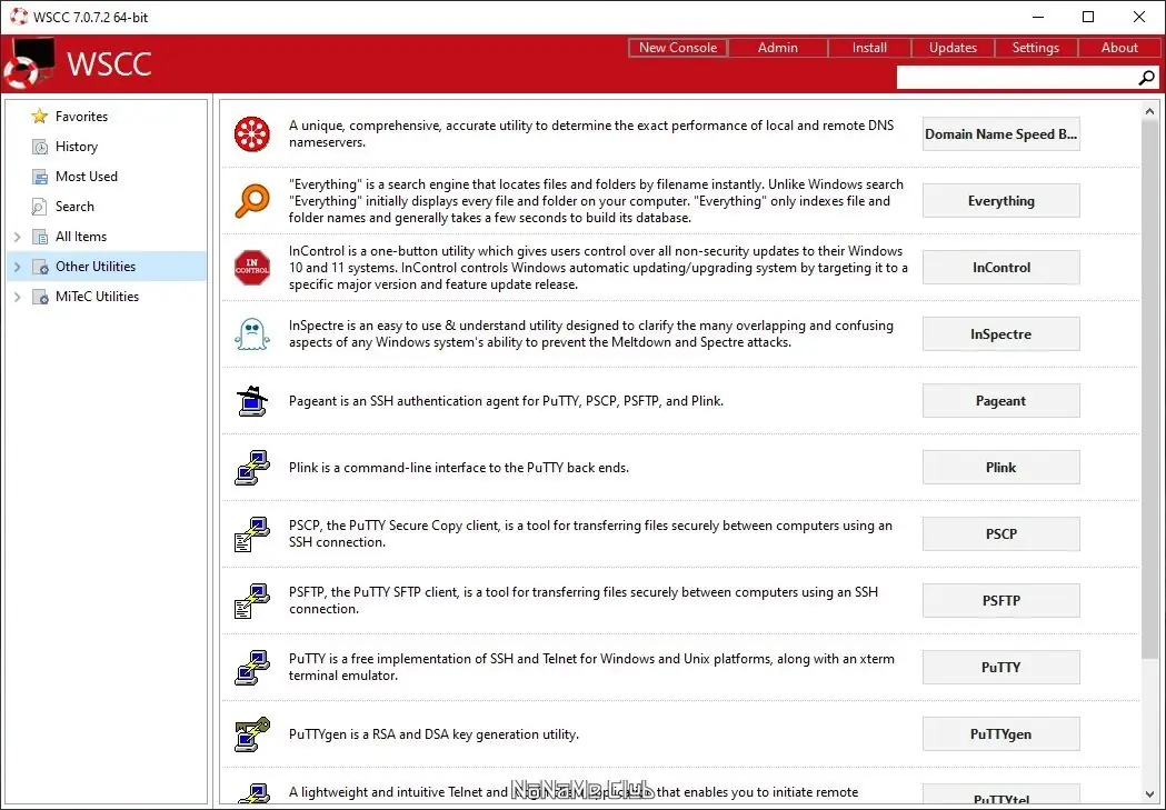 WSCC (Windows System Control Center) — портативное приложение, объединяющее мощные инструменты системного администрирования из пакетов Sysinternals Suite и NirLauncher. Программа позволяет быстро запускать более 300 утилит для диагностики, настройки и восстановления операционной системы без установки.
