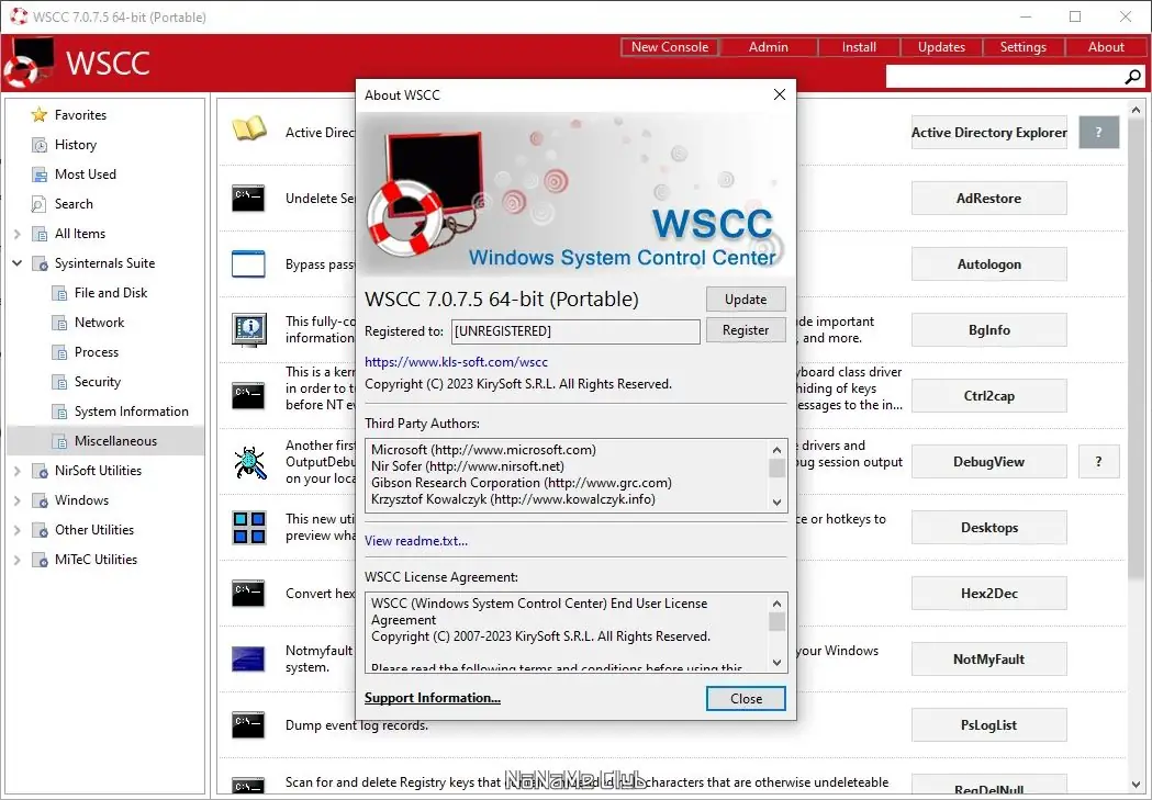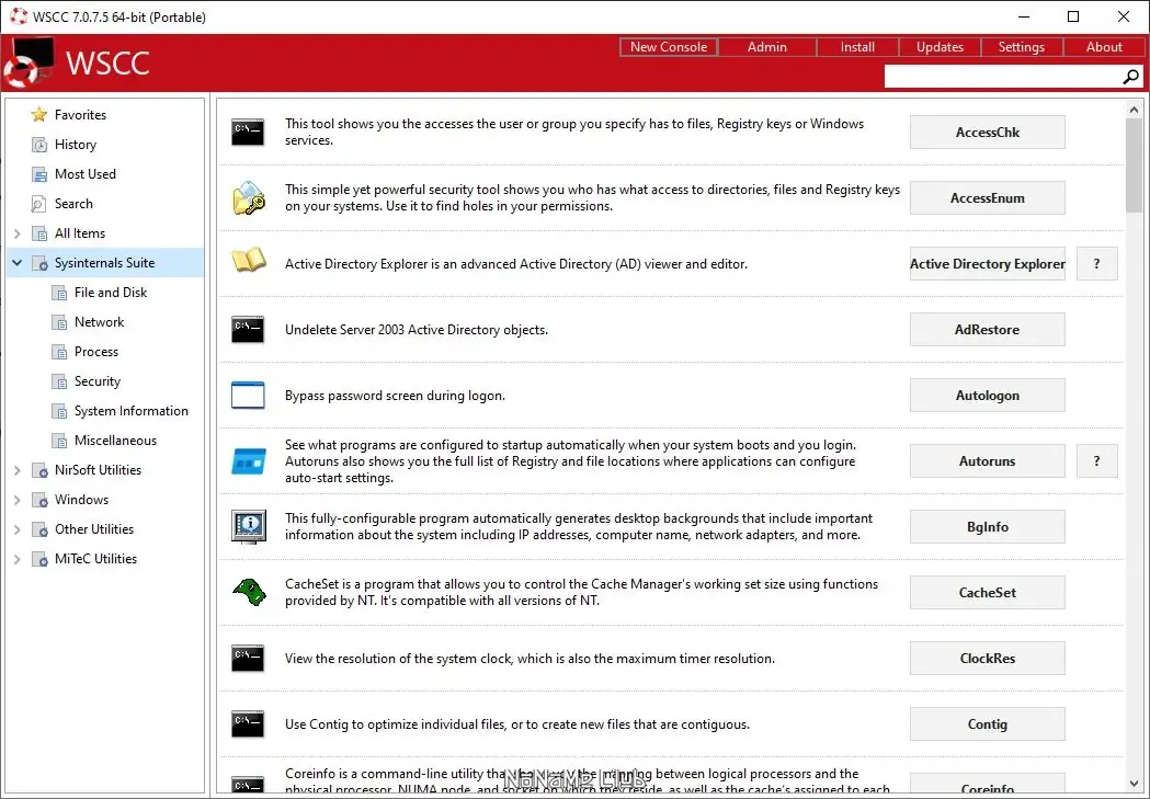 WSCC — это портативный инструмент для управления и запуска системных утилит Windows, объединяющий в себе коллекции Sysinternals Suite и NirLauncher. Программа организует более трёхсот служебных инструментов в удобной оболочке с функциями поиска, избранного и автоматического обновления, что делает её незаменимой для администраторов и продвинутых пользователей.
