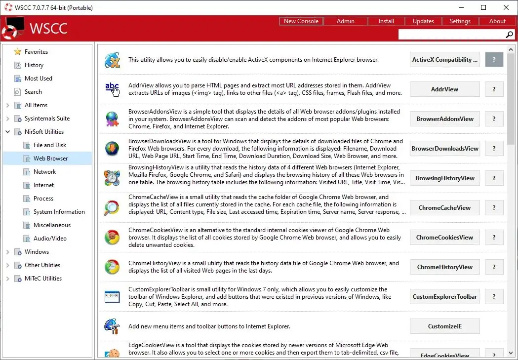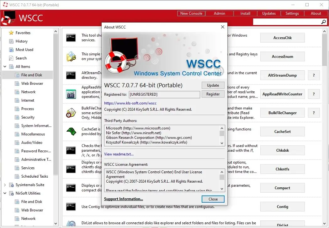 WSCC — это портативный центр управления системой Windows, объединяющий сотни диагностических и административных утилит из пакетов Sysinternals Suite и NirLauncher. Программа не требует установки, поддерживает быстрый запуск инструментов, обновление компонентов и удобную навигацию по категориям. Идеальное решение для IT-специалистов, системных администраторов и пользователей, которым нужен быстрый доступ к мощным инструментам диагностики и настройки.